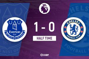 上半场伤停补时2分钟,半场结束,切尔西暂0-1埃弗顿。