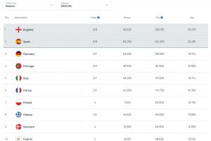 本赛季各联赛欧战积分排名:
