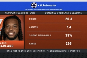 过去5个赛季,加兰场均20.3分7.4助攻,三分命中率39%,是过去5个赛季联盟唯一场均达到这三项数据的球员。