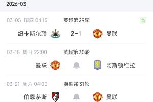 体育资讯03月05日讯 英超第29轮,曼联1-2不敌十人纽卡,因维拉本轮同样输球,曼联仍居第3。