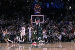 骑士最后一攻不暂停,施罗德带球上篮丢了,但是阿伦拿到前场板勾手打进,可惜超时了。